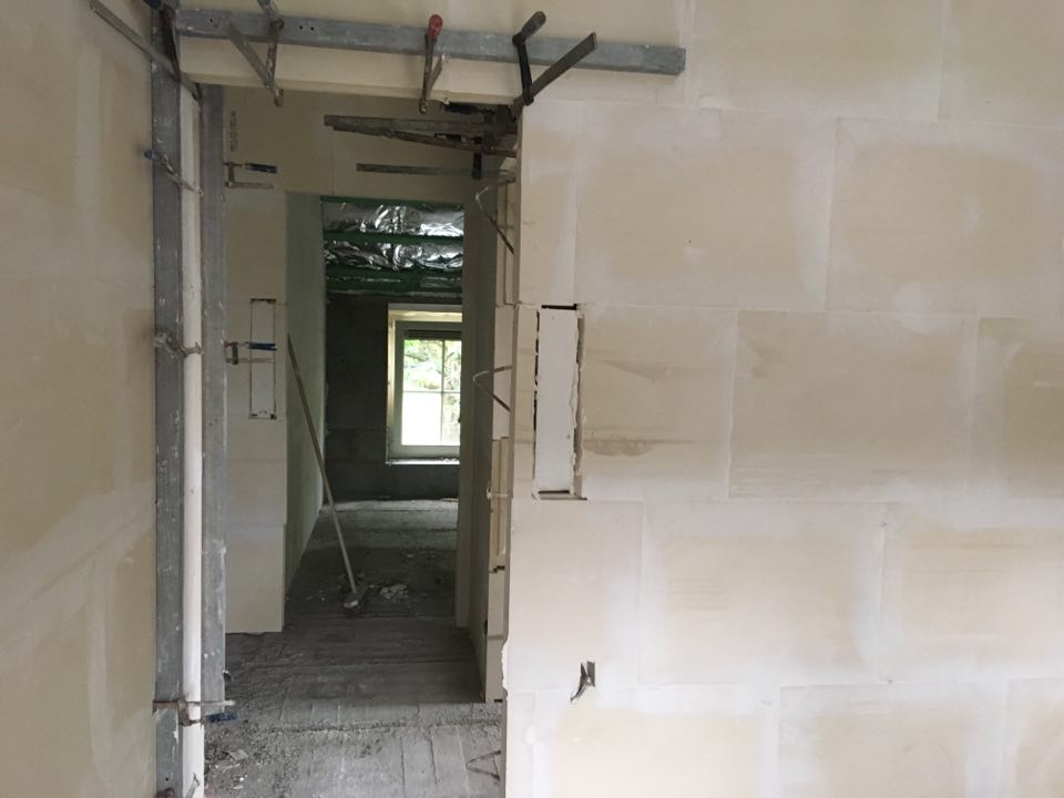Le Vendredi, comme prévu, les ouvriers sont là pour mettre les cloisons de plâtre à l'étage. Un ouvrier vient même le dimanche qui suit pour faire les petites finitions. Il restera également à faire la cloison de la toilette sous l'escalier.