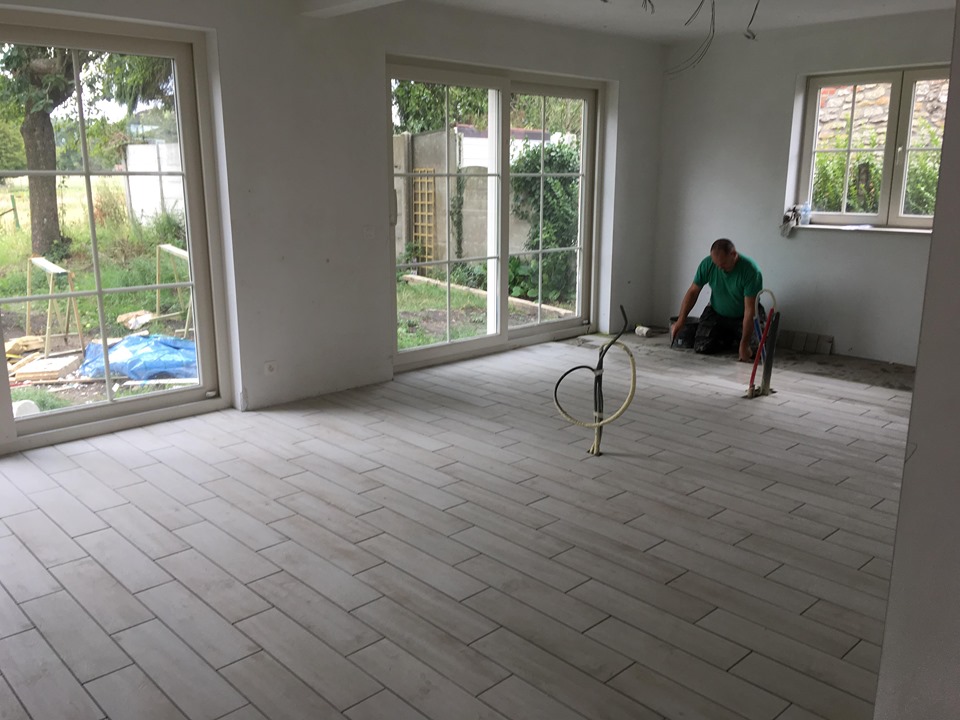 Le Jeudi 15 Août, livraison du carrelage. Et dès le Vendredi, les carreleurs sont là.