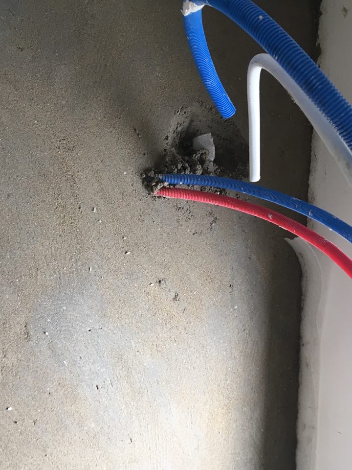 On remarque par ailleurs que le tuyau d'évacuation du bain ilôt n'a pas été repositionnée comme nous l'avions demandé... Il faudra donc qu'on casse la chape avant le carrelage pour prolonger l'évacuation jusqu'à la position du futur bain en ilôt.