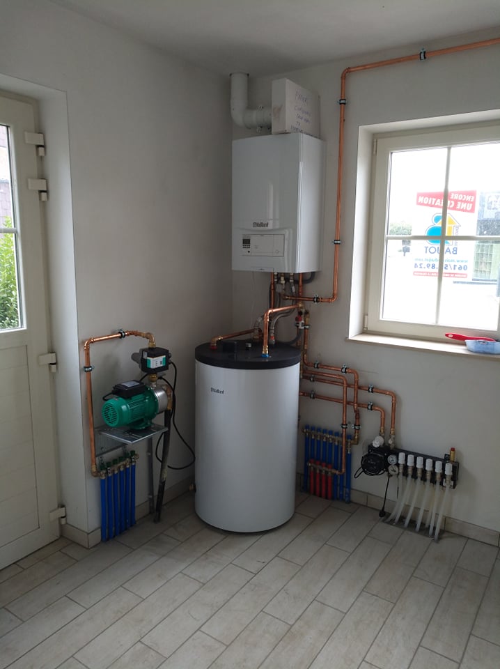 Surprise ce Samedi, le chauffagiste est là. Il installe le boiler. Par contre, erreur sur son bon de commande. Il ne savait pas que nous avions le gaz de ville. Aussi, il avait l'indication que le gaz arrivait près de la porte de la buanderie (là où il allait positionnait le chauffe-eau), hors il est de l'autre côté. Il faudra donc mettre un tuyau qui traversera la pièce jusqu'au chauffe-eau... Tant pis.