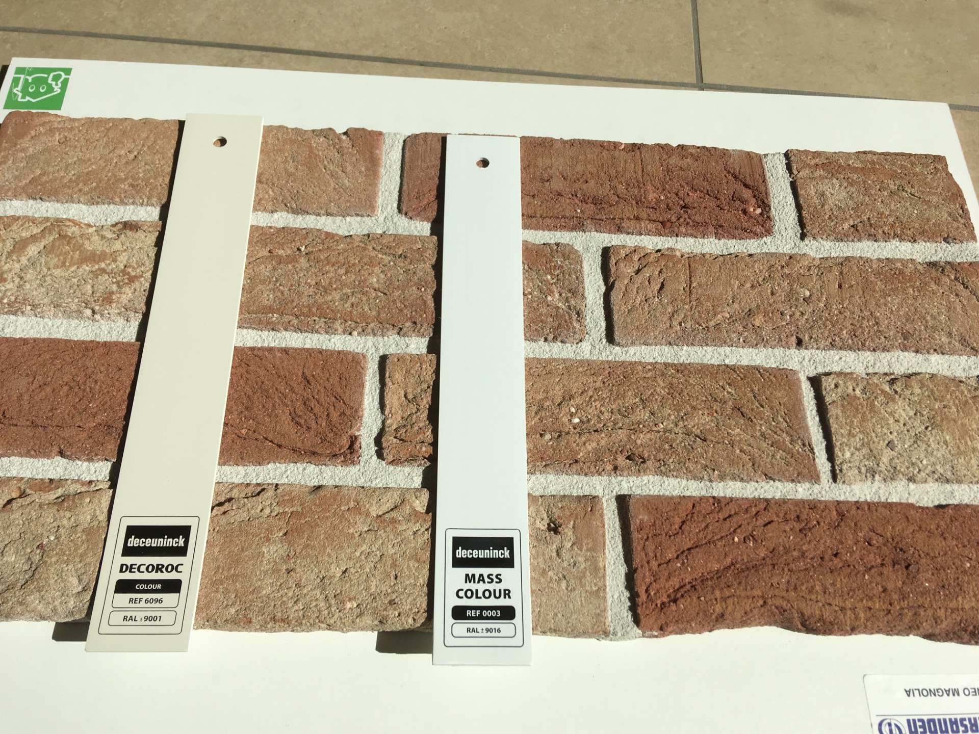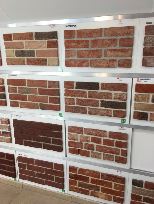 Un choix qui n'est pas si simple. Il y a beaucoup de choix, et environ 10 pour le premier choix. Nous trouvons les briques "vieillis" vraiment super belles, mais malheureusement hors de prix (le responsable nous informe qu'on dépasse rapidement les 6-7000 euros). Nous hésitons finalement entre deux briques semblables (pastilles vertes = dans le choix), mais l'une d'entre elles est fort demandée, et les délais d'attente sont d'environ 6 mois. Ce qui ferrait bien ralentir les travaux. Nous finissons par jeter notre dévolue sur celle-ci.