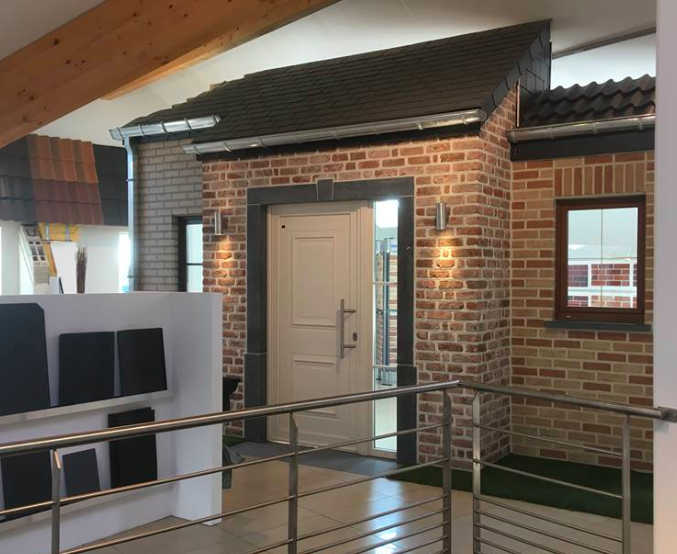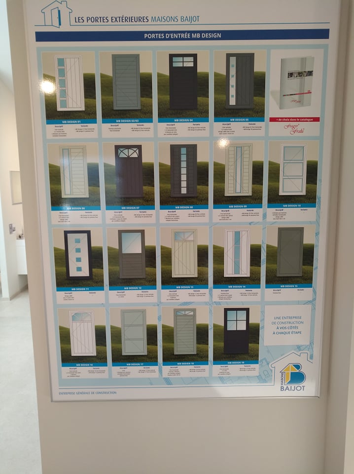 Nous hésitons avec l'unique porte d'entrée exposée dans le show-room, mais ce sera un supplément d'environ 1000 euros d'après le responsable. Nous abandonnons donc l'idée.