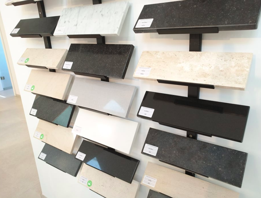 Le responsable du showroom explique d'emblée qu'il n'est pas commissionné pour nos débordements de prix. Il ne gagne rien à ce que nous choisissons les matériaux les plus chères. Il explique être totalement transparent avec nous, et nous informera clairement à chaque supplément que nous demandons.