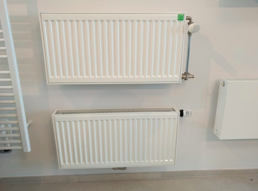 Pas beaucoup de choix. Nous optons pour le premier choix, radiateur du haut. Mais comme nous avons choisi un carrelage "entièrement dans le premier choix (carrelage, pose et plinthe vert), le responsable nous fait cadeau du radiateur en second choix (celui du bas, avec la vanne thermostatique un peu plus jolie).