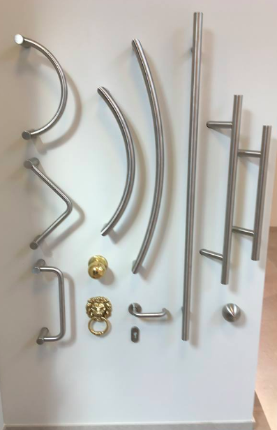Petite surprise : dans le choix de base, il s'agit d'une bête clinche de chaque côté de la porte. Pour avoir un tirant de porte (en inox), il faut payer un supplément : 387,56 euros. Nous optons pour le deuxième tirant (partant de la droite). Pour la porte latérale, nous gardons une simple poignée.