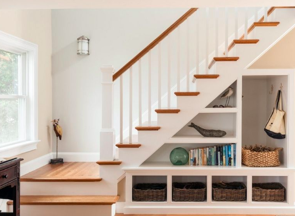 L'escalier est l'une des grosses préoccupations. Mon épouse le voulait dans un style cottage, avec un pallier. Un peu comme sur l'image ici. Nous aurions peint l'escalier, et aurons créé l'espace de rangement en dessous.