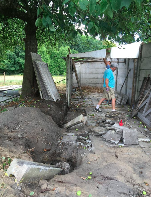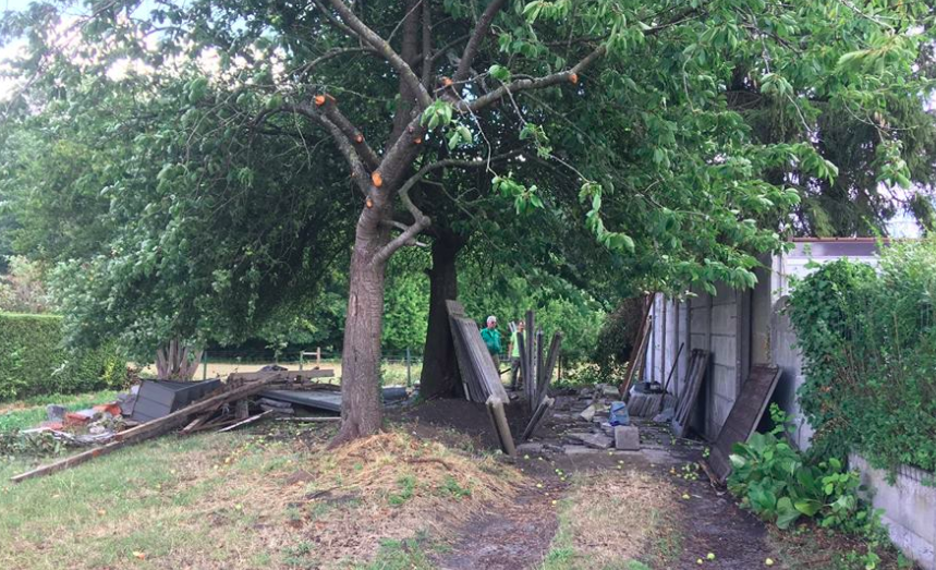 Dès que possible, nous nous y mettons pour démolir les garages en place sur le terrain. Cela nous demandera quelques jours, et beaucoup d'énergie ! Nous profitons également de notre temps libre pour élaguer les arbres. Ce sera du bois pour notre insert ! Il restera donc dans un coin du terrain pendant une grosse année.