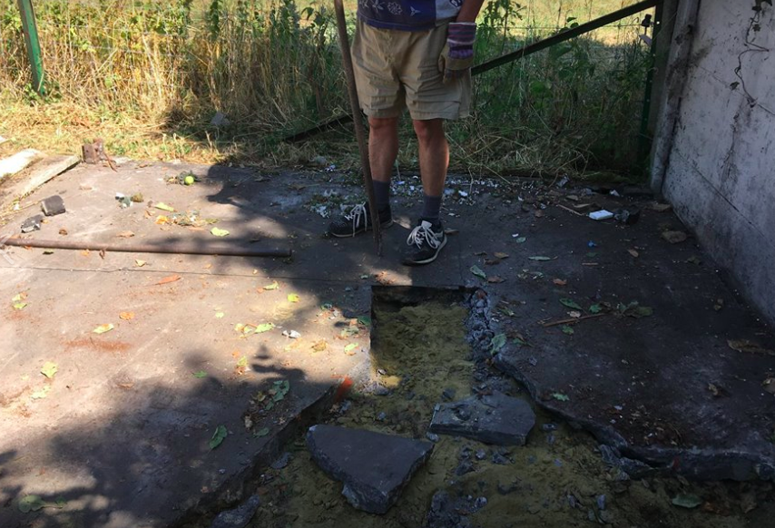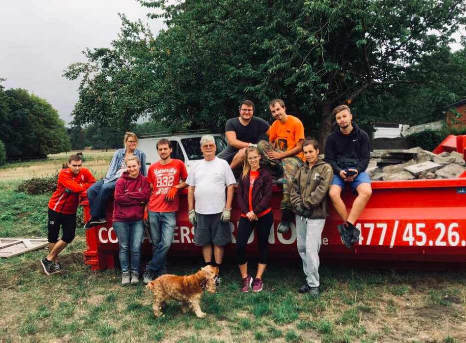 Pour nous débarrasser de tous les déchets de béton, nous avons loué un container (180 euros), et nous avons demandé à la famille et aux amis un coup de main ! Il nous aura fallu une matinée et un bon barbecue en récompense.