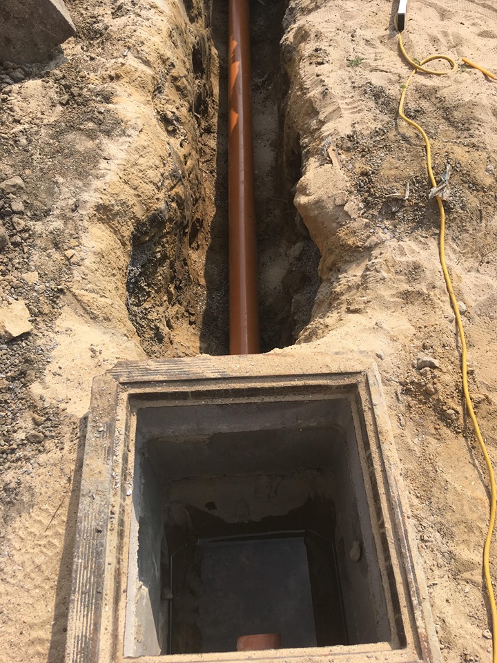 Comme vous le voyez, la chambre de visite "trop plein" est une chambre siphonique. On ne voit donc pas l'extrémité du tuyau de l'autre côté.