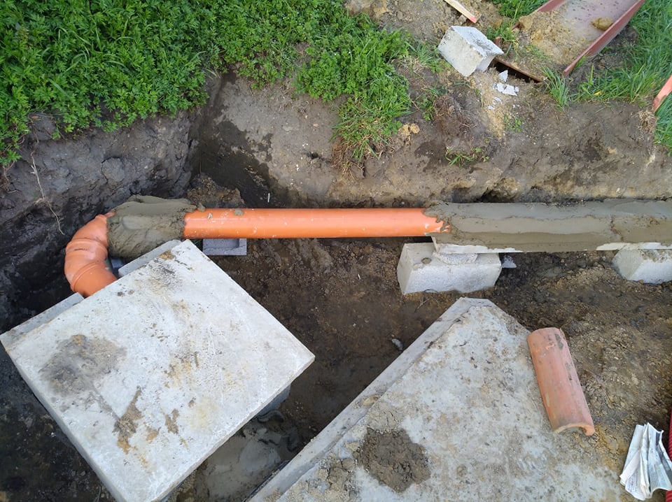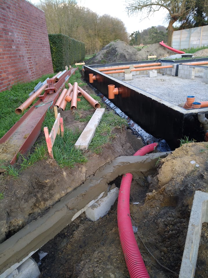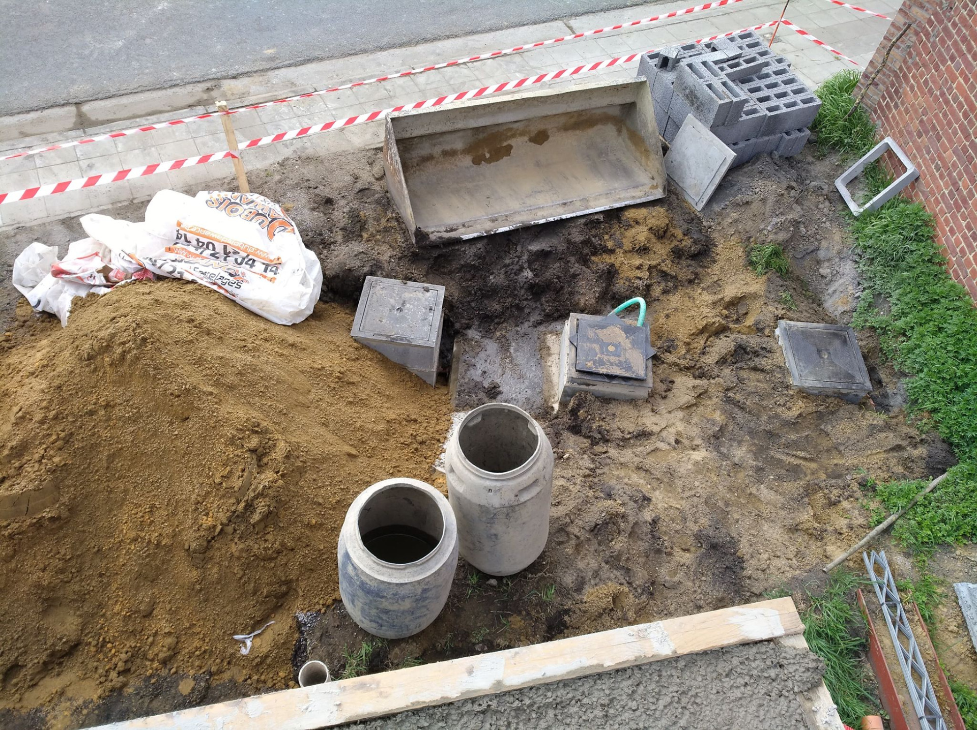 Ce jour là, étant en congé, j'avais convenu rendez-vous avec ORES pour un "repérage" des lieux. Juste un petit soucis, comme nous avons changé le plan d'égouttage, un tuyau d'évacuation passe juste au niveau de l'accès des impétrants (tuyaux rouges), et c'est à ce niveau qu'ORES aimerait installer le gaz. Des câbles peuvent passer à ce niveau en les "coudant", mais le tuyau de gaz est rigide et ne peut être "plié".... J’appelle donc un ouvrier qui me dit qu'il rectifieront cela. Je ne sais pas encore comment...
