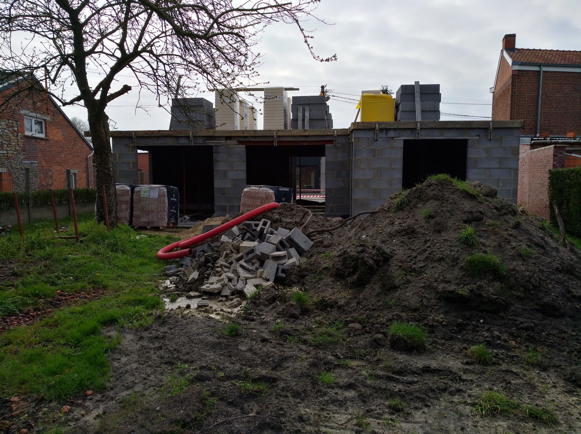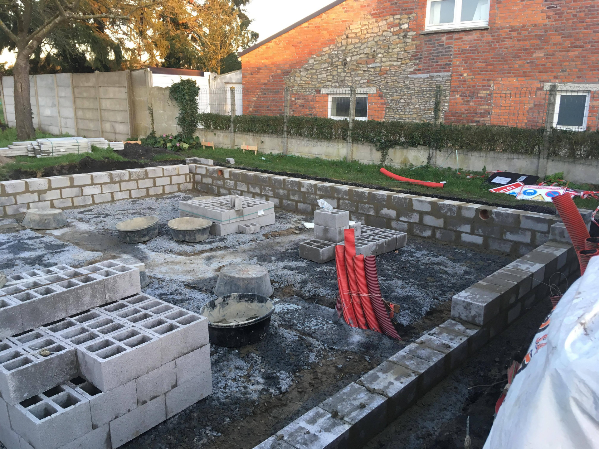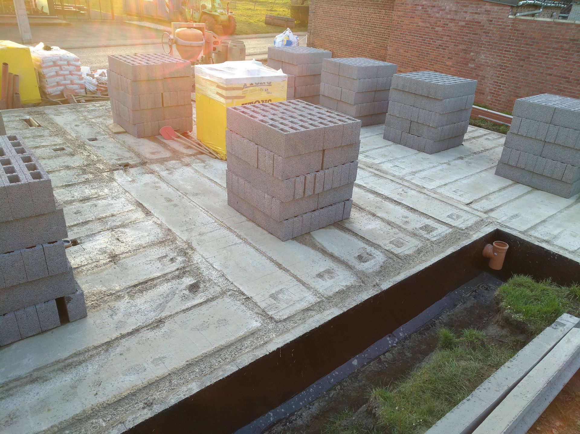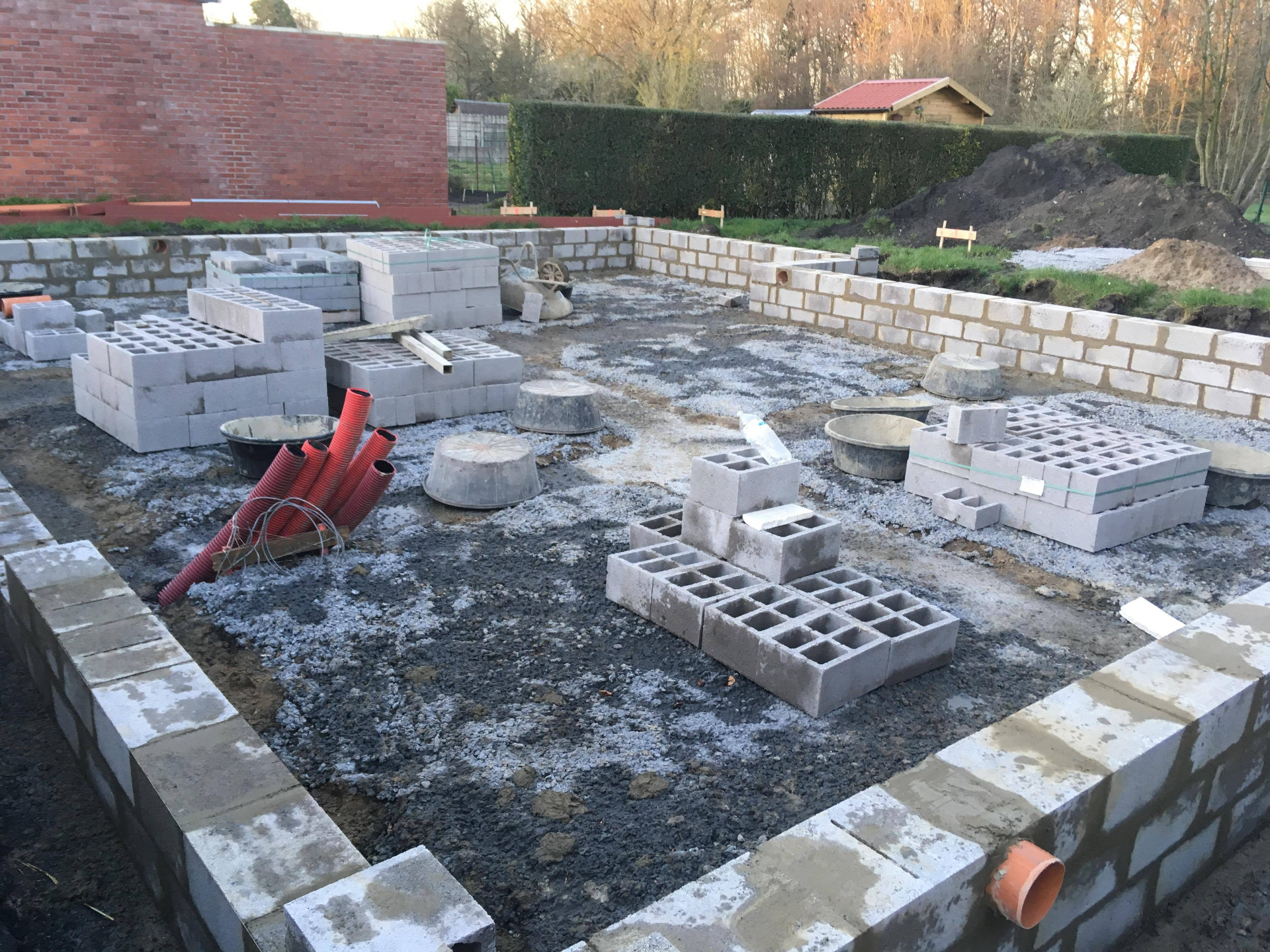 4ème jour, Jeudi. Les hourdis sont bien arrivés et ils ont déposé des palettes de briques à l'arrière ainsi que les blocs d'argex.