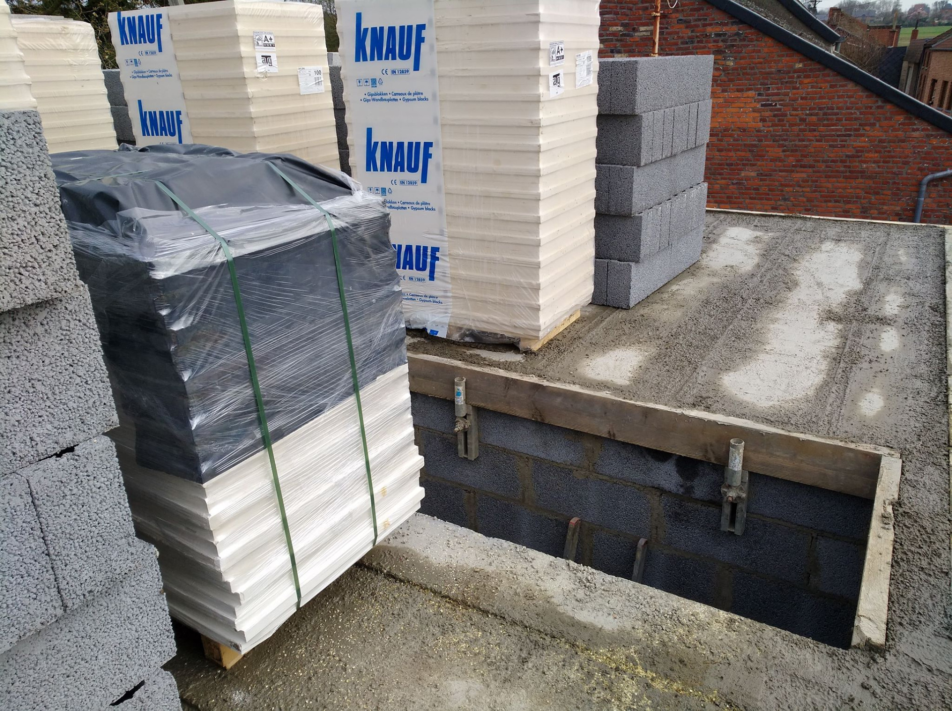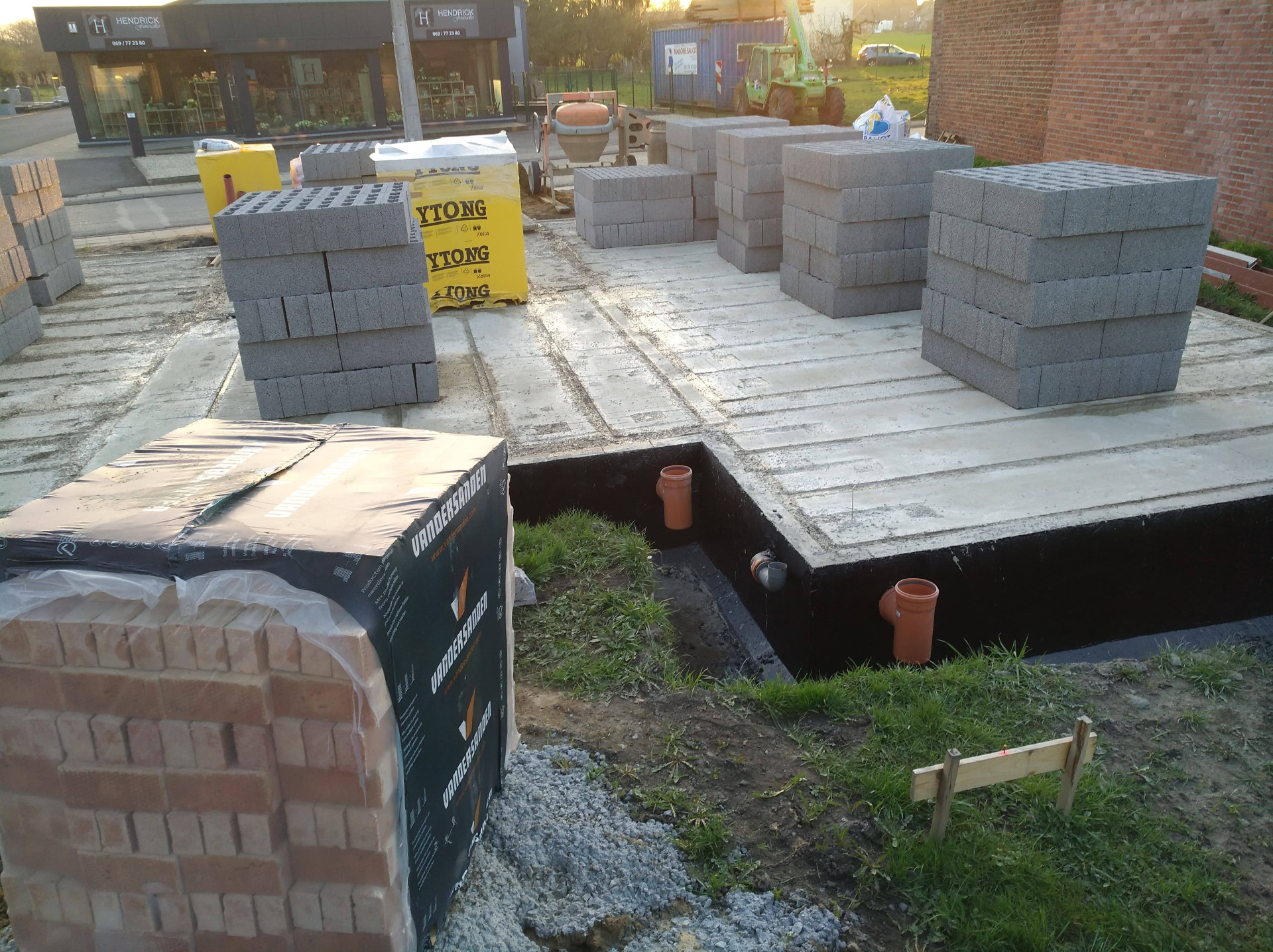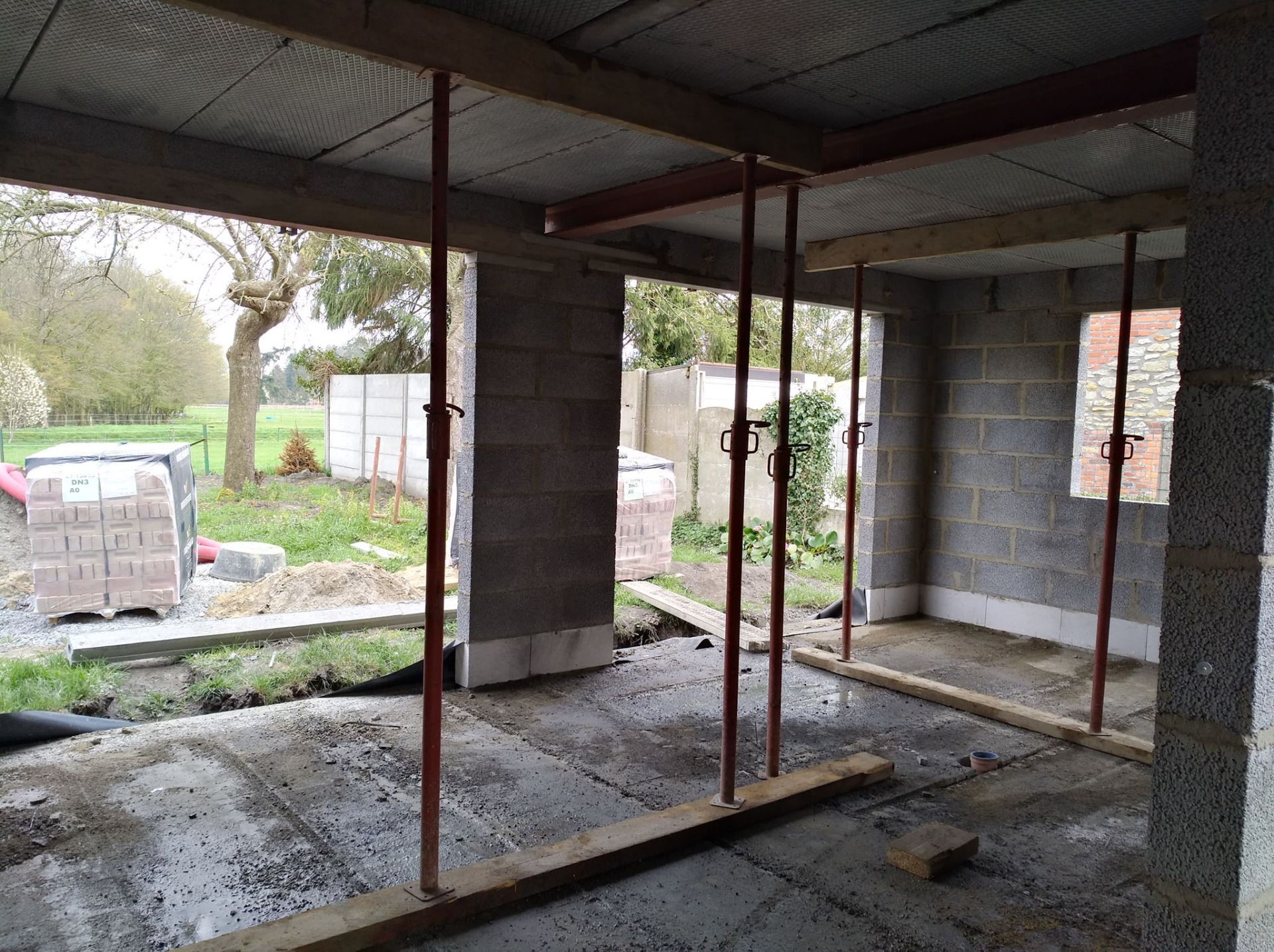 4ème jour, Jeudi. Les hourdis sont bien arrivés et ils ont déposé des palettes de briques à l'arrière ainsi que les blocs d'argex.