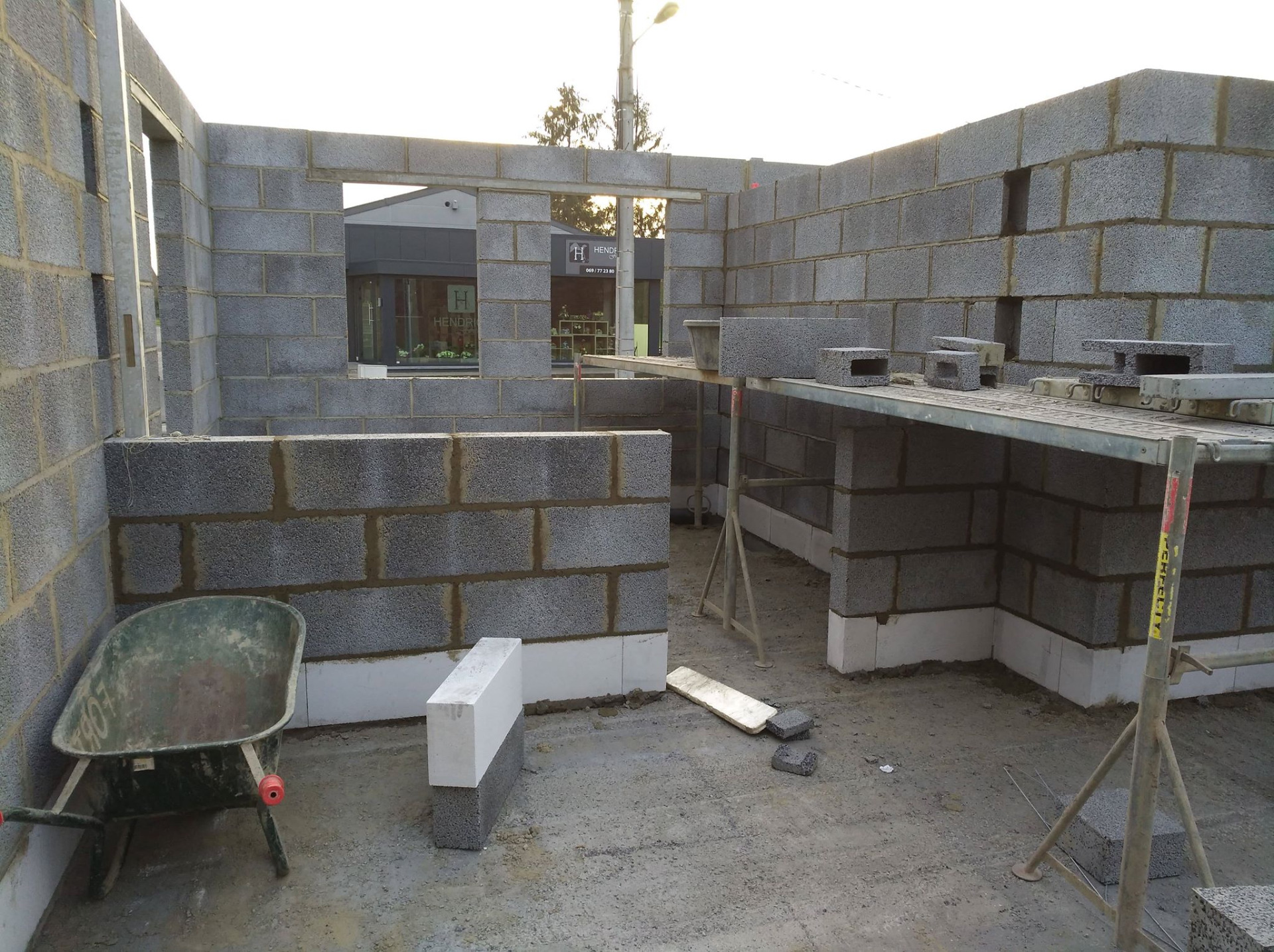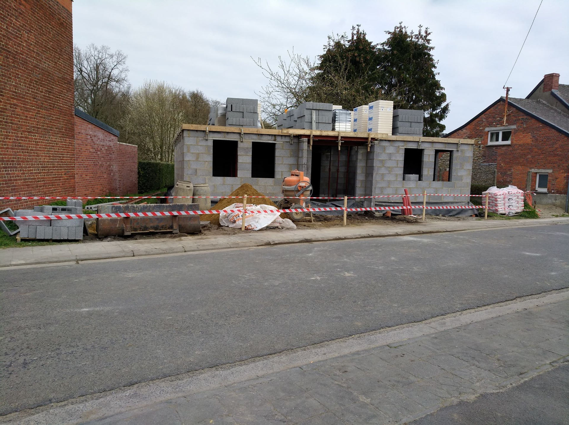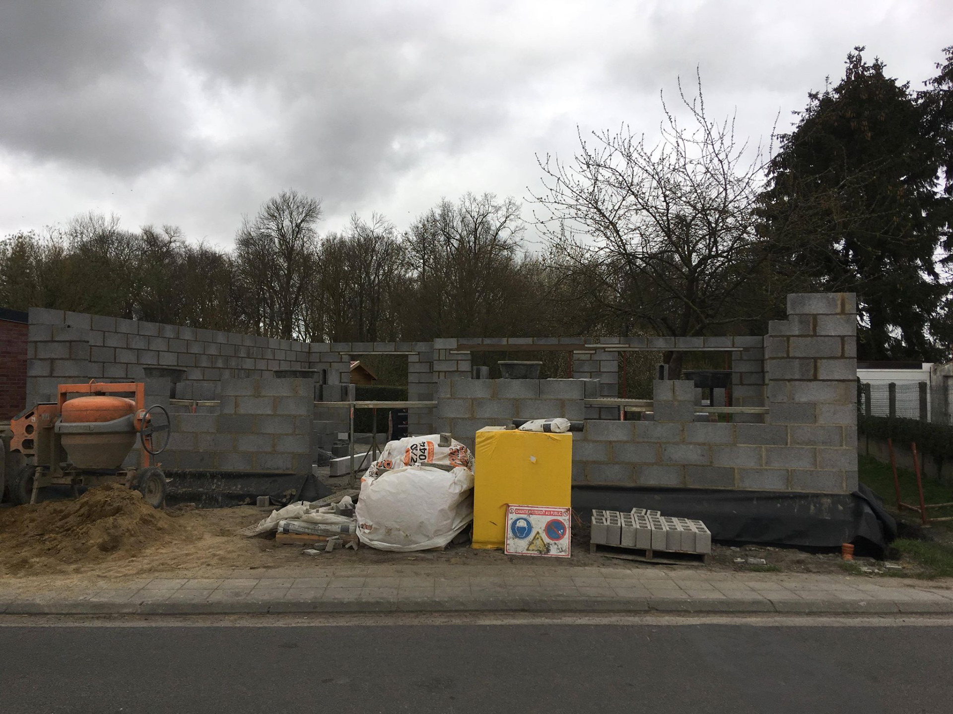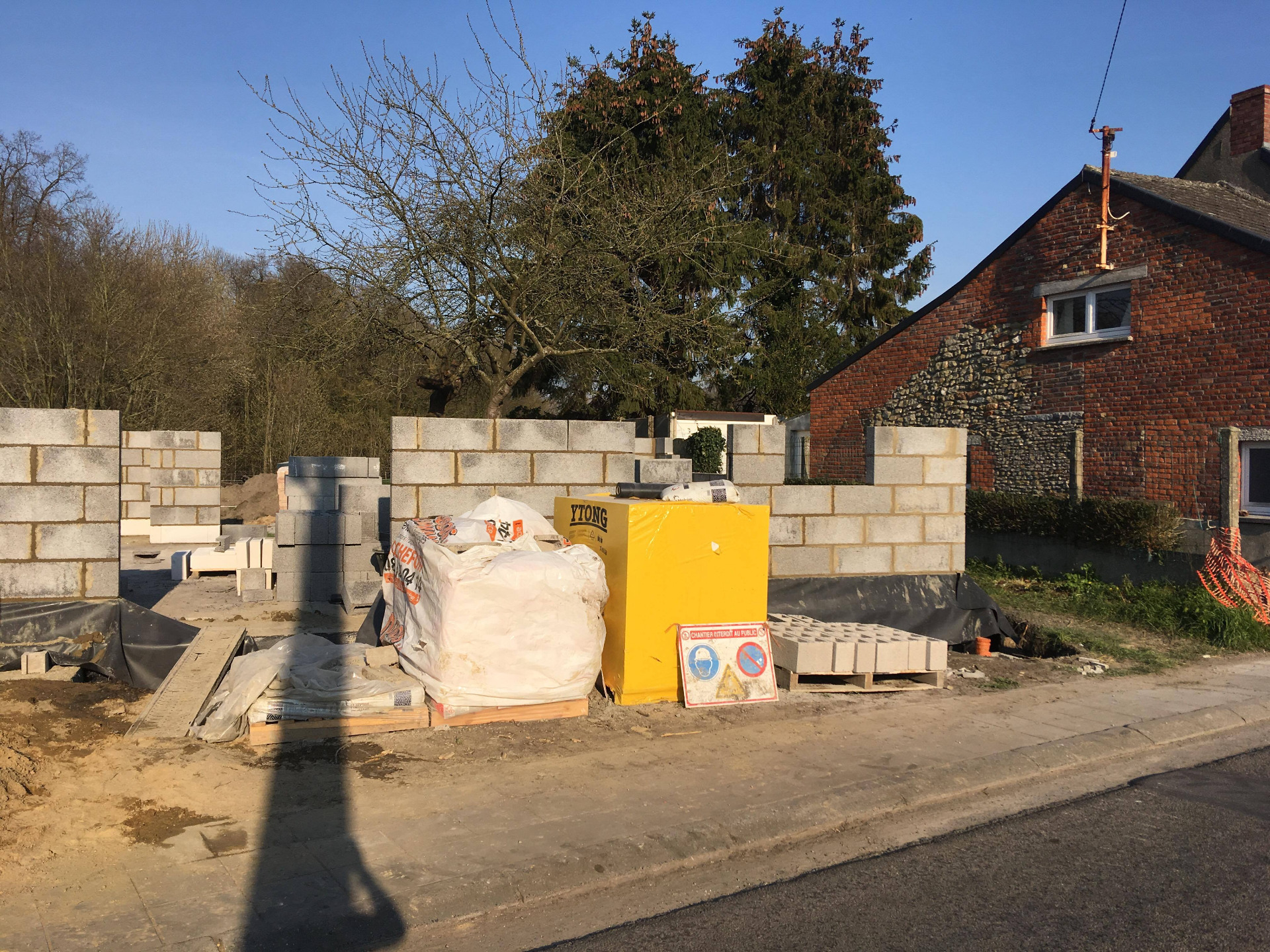 4ème jour, Jeudi. Les hourdis sont bien arrivés et ils ont déposé des palettes de briques à l'arrière ainsi que les blocs d'argex.