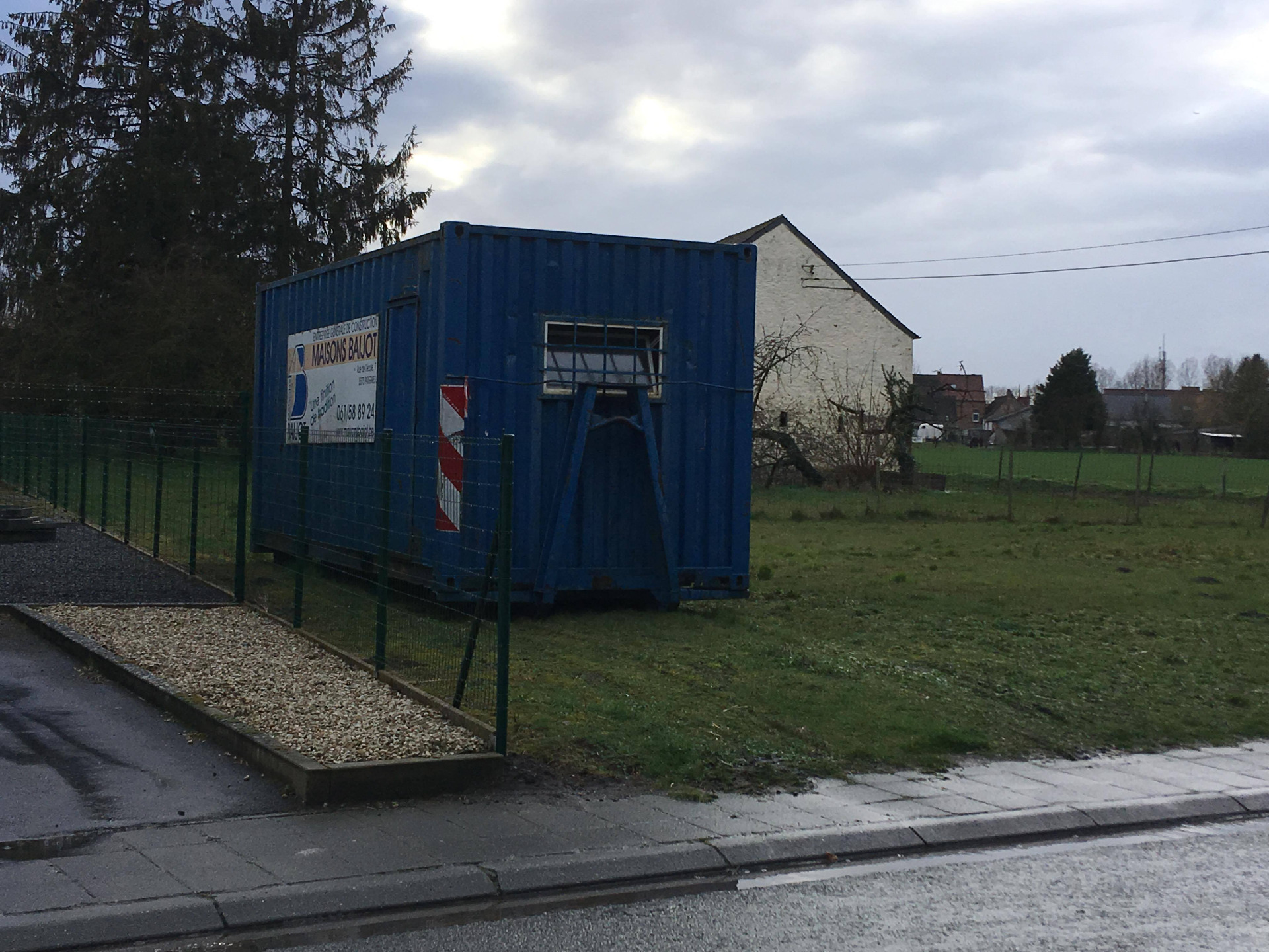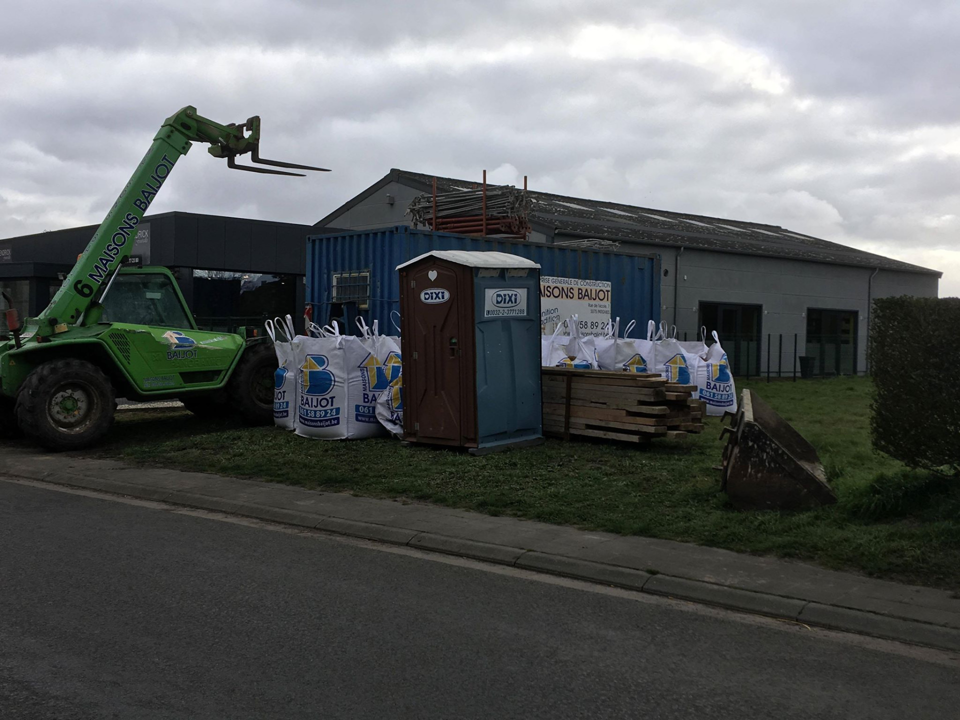 Enfin ! 1 mois et 13 jours après le terrassement (237 jours après accord de l'urbanisme donc 7,5 mois), les matériaux (bétonneuse, container) sont arrivés le Jeudi 21/03, et le chantier commence réellement ! Pour rappel, notre voisin avait gentiment accepté de recevoir le container à matériaux sur le terrain, ainsi que le manitou baijot.